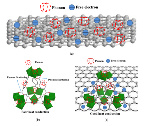 Figure 6. (a) FLG, (b) MIL-101和(c) MIL-101/FLG 復合材料的結構及導熱機理示意圖。