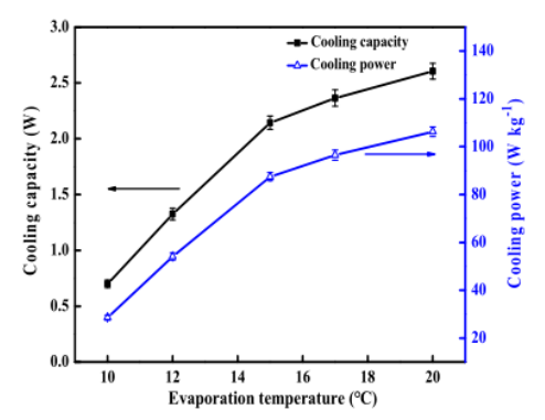 Figure 7. MIL-101/20%FLG-水工作組在不同蒸發溫度時的冷卻能力和冷卻功率。