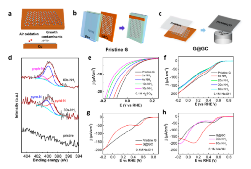 Figure 2. 用于ORR的石墨烯電極制備。(a) CVD 石墨烯薄膜的非對稱表面示意圖。(b)制備原始石墨烯。(c)制備G@GC。(d) N1s XPS光譜。(e) 線性掃描伏安法 (LSV) 極化曲線。 (f) 氮化0至60秒后石墨烯的LSV曲線。 (g) 原始G和 G@GC的LSV 曲線。(h) G@GC在氮化30和60 s前后的LSV曲線。