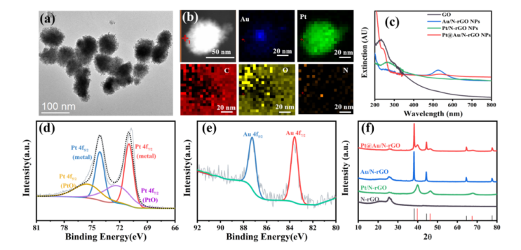 1.4@Au/N-rGO的(d)Pt 4f和(e)Au 4f的XPS 光譜。(f) N-rGO、Au/N-rGO、Pt/N-rGO 和 Pt