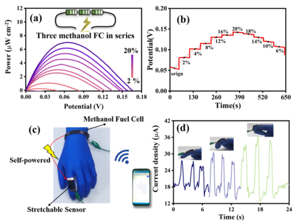 可穿戴自供電傳感器是最近柔性電子設備的一個有前途的前沿領域。 在這項工作中,已經制造了一種可穿戴燃料電池(FC)型自供電運動智能傳感器,特別是首次選擇甲醇蒸汽作為目標燃料。Pt@Au/N-rGO 的核殼結構和多孔碳網絡作為甲醇氧化和氧還原反應催化劑,高導電堿性水凝膠作為固態電解質。 因此,用于自供電傳感系統的可穿戴 FC 對 2-20% (v/v) 甲醇蒸汽表現出優異的傳感性能,最大功率密度為 2.26 μW cm