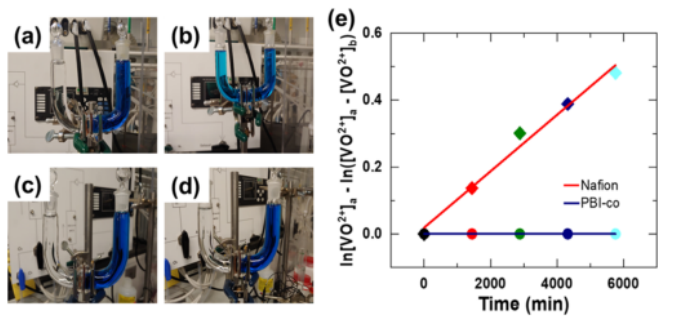 圖 3.顯示釩離子擴(kuò)散通過(a) Nafion:0 小時,(b) Nafion:20天后,(c)功能化 PBI-co:0小時,(d)功能化PBI-co:后的擴(kuò)散池照片 20 天,以及(f)作為時間函數(shù)的釩濃度的 UV-vis 分析。下標(biāo)a和b分別代表富釩半電池和空白半電池中的釩離子濃度。