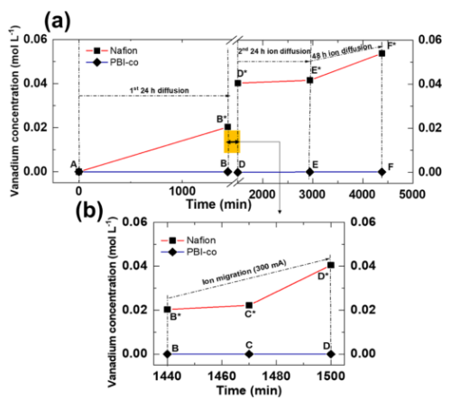 圖 6.空白半電池中作為時間函數(shù)測量的釩離子濃度分析顯示(a)離子遷移前的第一個24 小時釩離子擴(kuò)散期和離子遷移后的第二個24小時擴(kuò)散期和48小時擴(kuò)散期 對于功能化的 PBI-co 和 Nafion 膜,遷移和(b)在施加300 mA電流1小時期間經(jīng)受離子遷移的釩離子交叉。