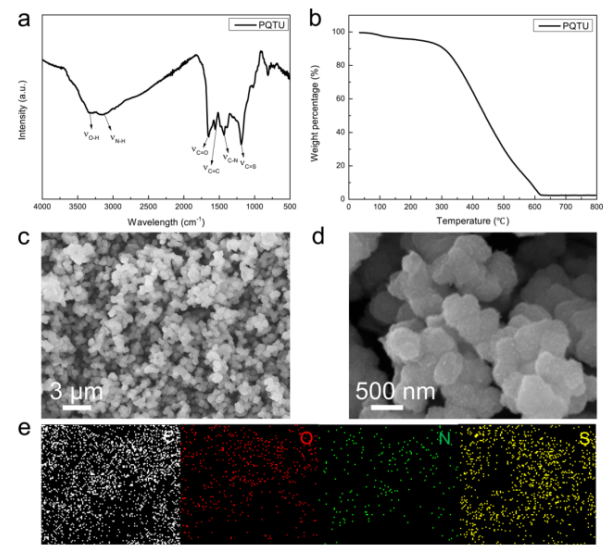 圖 2. PQTU 的表征。(a) FT-IR光譜。(b)TG 曲線。(c)和(d)SEM圖像。(e) C、O、N和S 的元素映射。