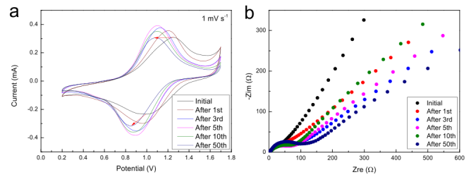 圖 5. (a) CV 曲線和(b) PQTU∥ZnSO4∥Zn 電池在不同放電/充電循環(huán)后的 Nyquist 圖。