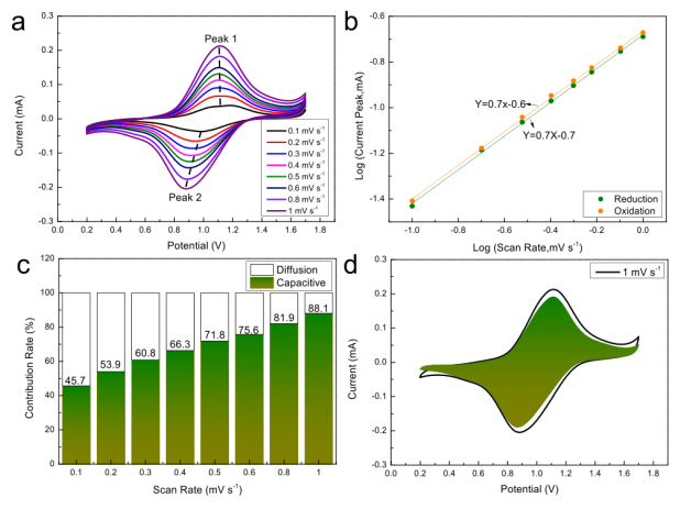 圖6.(a)PQTU在不同掃描速率下的CV曲線。(b)在氧化還原和氧化峰處對(duì)應(yīng)的log(峰值電流)與log(掃描速率)圖。(c)PQTU在不同掃描速率下的電容和擴(kuò)散控制的貢獻(xiàn)率。 (d)PQTU∥ZnSO4∥Zn電池在1mVs1時(shí)的電容和擴(kuò)散控制電流貢獻(xiàn)。