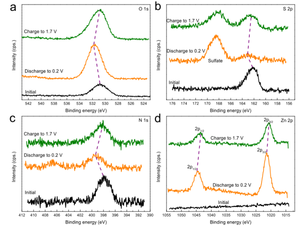 圖 7. (a) O 1s、(b) S 2p、(c)N 1s和(d) Zn 2p的非原位XPS精細(xì)光譜。