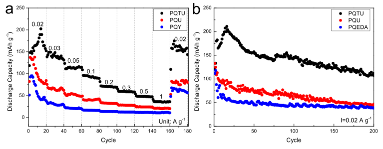 圖10. (a) PQTU、PQU和PQEDA的放電比容量比較。(b)PQTU、PQU和PQEDA在0.02 A g-1下的放電長(zhǎng)循環(huán)比較。