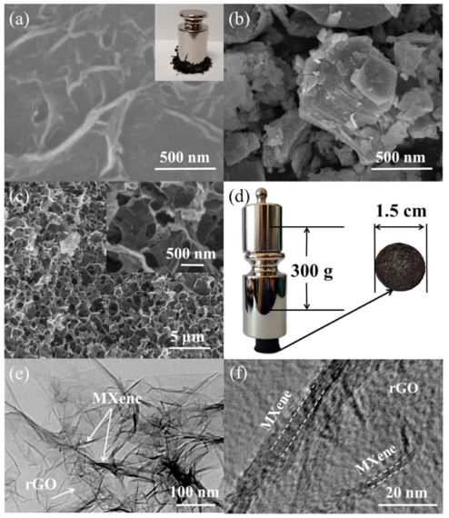 x MXene、(c)S,N-rGO@MXene的SEM圖片;(d)直徑1.5 cm的S, N-rGO@MXene氣凝膠上承受壓重為300 g的光學照片;(e, f) S,N-rGO@MXene的TEM圖像。