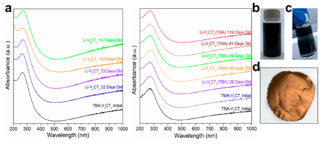 MXene型碳化釩,特別是V2CTx型碳化釩,在從能量存儲、傳感到電子和光學等諸多領域都有應用前景。然而,在過去的十年中,由于分層的V2CTx在膠體狀態下的不穩定性,有關V2CTx的研究大多局限于其多層形態。在本文中,報道了溫和的合成條件,從而得到高質量的V2CTx和離子交換過程,將MXene在水懸浮液中的保質期增加了大約3個數量級,從幾個小時到幾個月。討論了蝕刻和分層機制,并為研究人員提供了一個指導方針與MXene組成。解釋了蝕刻劑配方、分層化學品和后處理對合成的V2CTx的質量、化學穩定性和光電性能的影響。在離子交換和絮凝過程中,四丁基銨和四甲基銨離子被鋰離子取代。分層后的V2CTx產生的沉淀物不僅可以懸置幾個月而不降解,還可以重新分散并加工成薄膜。這些MXene薄膜在光學和電子性能上有明顯的改善。它們在干燥狀態下的電導率可以超過1000 S cm-1,這是之前V2CTx無法達到的值。在本工作中,V2CTx的貨架壽命和性能的主要改進,有望使這種MXene的性能的基礎研究,并大大擴大其潛在的應用范圍。建議的方法可能適用于其他需要使用季胺進行分層的MXenes。