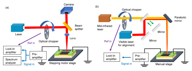 圖2. (a)探測可見光(690 nm)及NIR光(1310 nm和1530 nm)的測量裝置示意圖。利用步進(jìn)電機(jī)工作臺移動樣品,改變激光光斑的位置。利用分光鏡檢測反射光,并通過攝像機(jī)調(diào)節(jié)照射位置。輸出信號由低噪聲前置放大器放大,并由鎖相放大器和頻譜分析儀測量。(b) MIR光(4.6μm)測量裝置示意圖。將可見光引入同一光路,調(diào)整MIR光的照射位置。輸出信號由低噪聲前置放大器放大,并由鎖相放大器測量。