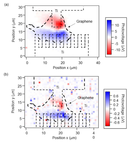 石墨烯是開發(fā)高速、寬波長范圍光電探測器的理想材料。但是,由于石墨烯兩端兩個電極的每一個石墨烯/電極界面上的光電壓極性相反,它們在宏觀光照射到光電探測器時被抵消了。在本研究中,我們提出了兩種基于石墨烯的光電探測器,它們具有不同的非對稱器件結(jié)構(gòu),可以抑制兩電極界面上的光電壓抵消。其中一種光電探測器有一個局部蔭罩,只有石墨烯/電極界面的一側(cè)被金屬蔭罩遮蔽。另一種具有不同形狀的電極,通過使用梳狀電極,石墨烯/電極界面的接觸面積不同。通過掃描石墨烯光電探測器周圍的聚焦光,我們測量了光探測的位置依賴性,由于兩個光電探測器的非對稱結(jié)構(gòu),可以得到不對稱的光電電壓映射。此外,我們還證明了通過抑制光電壓抵消,光電探測器在可見光、近紅外光和中紅外光區(qū)域的宏觀光探測。這些非對稱結(jié)構(gòu)的石墨烯基光電探測器適用于可見光、近紅外光和中紅外光區(qū)域?qū)挷ǘ蔚暮暧^光電探測器。