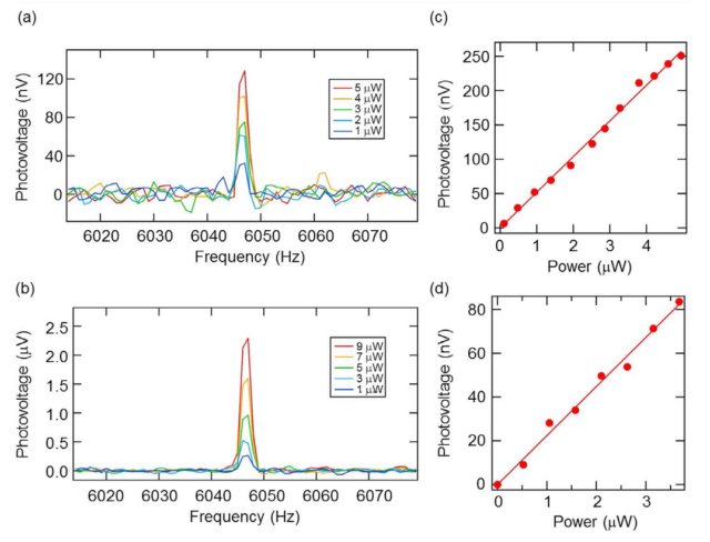 圖5. 在不同的激光功率下,用光譜分析儀測量了宏觀(a)可見光(690 nm)和(b)NIR光(1530 nm)光輻照下,Ni掩模石墨烯光探測器的調(diào)制光探測(6049 Hz)。用Ni掩模石墨烯光電探測器在211 Hz時的鎖相放大器測量的 (c)可見光(690 nm)和(d) NIR(1530 nm)的光電壓光強相關(guān)性。紅色的線顯示線性擬合的結(jié)果。