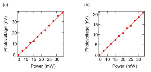 圖9. (a) Ni掩模和(b)梳狀電極的石墨烯光電探測器的宏觀MIR光電壓光強相關(guān)性。紅色的線顯示線性擬合的結(jié)果。