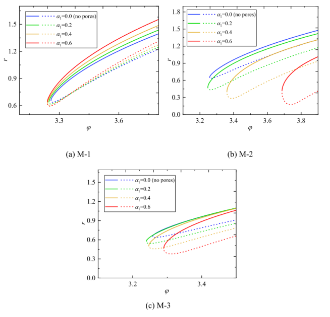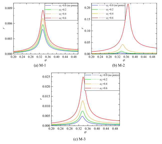 圖14. 不同孔隙度分布下的次諧波共振頻響曲線。