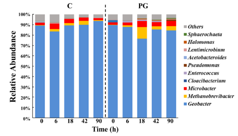 圖4. 不同時間(0、6、18、42和90 h)陽極生物膜不同屬的微生物群落。