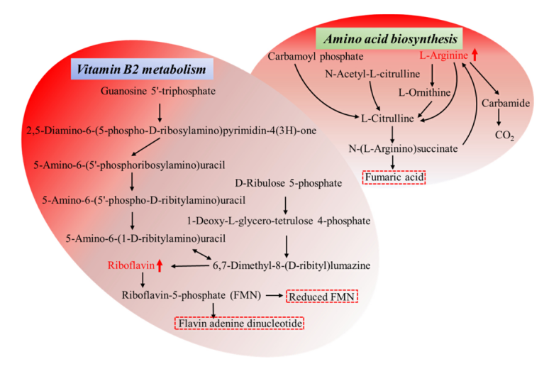 圖6. 受PANI/G改性電極主要影響的代謝途徑。紅色箭頭表示與C相比上調的代謝物,紅色框中的物質最終會上調。