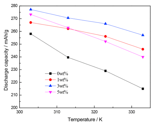 圖4. LaY2Ni9.5Mn0.5Al0.5+ x wt. %石墨烯電極的放電容量與溫度的關(guān)系。