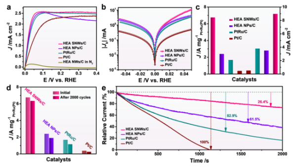 Figure 2. HEA SNWs/C和其他催化劑的HOR性能評估。a 極化曲線。b 塔菲爾圖。c 歸一化的質量和面積比活性。d 2000次循環前后的質量活性比較。e 不同催化劑在1000 ppm CO/H2飽和的0.1 M KOH電解液中,相對電流-時間計時電流響應。