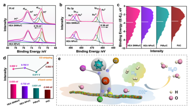Figure 3. 表面價帶光電子能譜分析。A Pt 4f XPS光譜。b Ru 3p XPS光譜。c 不同催化劑的d帶中心。 d不同催化劑的CO剔除電位和d帶中心位置。e在HEA SNWs/C催化劑上發生HOR的示意圖。