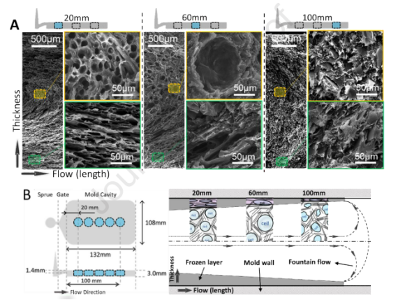 Figure 1.(A)HDPE/12.6% GnP復合泡沫在不同距離處的SEM圖(泡沫樣品具有7% VF)。(B)模塑樣品和尺寸的示意圖,復合材料在模具中的流動以及泡沫注射成型樣品的細胞形態。