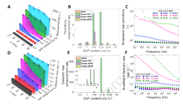 Figure 2. (A)對于固體和泡沫(7% VF) HDPE/GnP復合材料在不同位置的滲透曲線,(C)固體和(B,E)泡沫復合材料在不同GnP含量下的DC電導率,(D)顯示了電導率增強的速率,(F)HDPE/GnP復合材料(含有12.6 vol.% GnP,7%VF)的寬帶電導率。