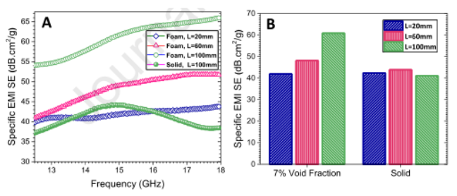Figure 4.HDPE/19vol% GnP和7%VF復合材料的比(A)EMI SE和(B)平均比EMI SE。