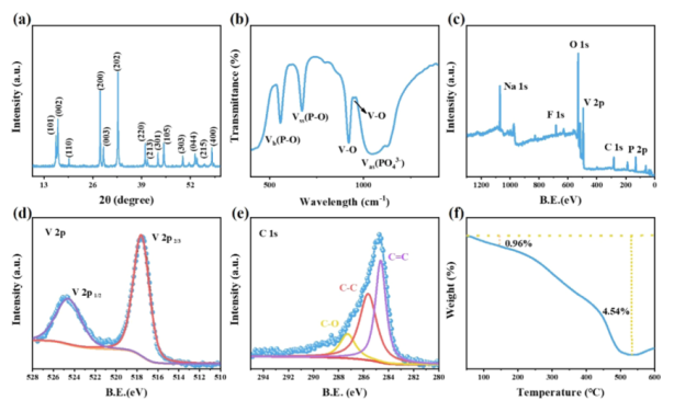 Figure 2. N@ rGO-4的XRD圖譜(a)、FT-IR光譜(b)、XPS光譜(C)、高分辨V 2p XPS光譜、(d) 高分辨C 1s XPS光譜(e)和熱重分析曲線(f)。