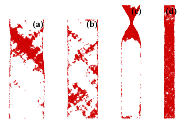 圖8. (a)14%應變下厚度為16.9 nm、(b)14%應變下厚度為14.9 nm、(c) 24%應變下厚度為9.0 nm、(d) 24%應變下厚度為5.0 nm 的MG快照。
