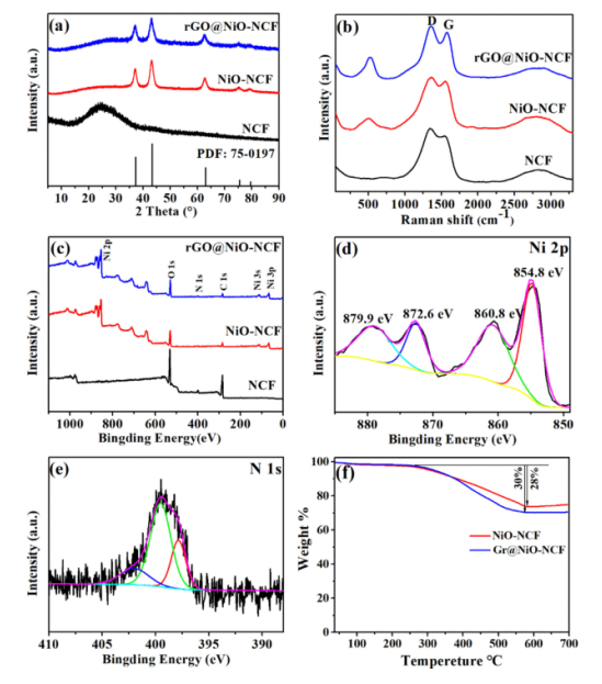 圖2. NCF、NiO-NCF和rGO@NiO-NCF的(a)XRD圖譜,(b)Raman光譜,(c)XPS測量譜圖,rGO@NiO-NCF的(d)Ni 2p和(e) N 1 s XPS譜圖,Ni-NCF和rGO@NiO-NCF的(f)TG曲線。