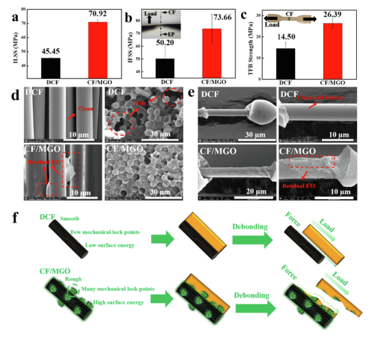圖4. CFRPs的界面性能:(a) ILSS,(b)IFSS,(c)TFB;(d) CFRPs脫粘后的斷面形貌;(e)CFs脫粘后的斷面形貌;(f)脫粘機理示意圖。