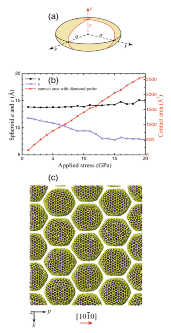 圖3. C720球體參數ac隨應力的變化。(a)球體形狀描述:參數ac分別表示赤道半徑和從中心到兩級的距離。(b)球體參數隨外加壓應力的變化。(c) 20GPa壓應力下包覆納米顆粒膜的結構。
