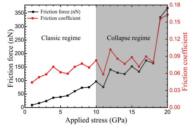圖4.包覆納米顆粒膜模型的摩擦力和摩擦系數。