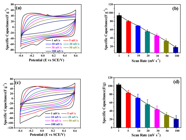 1/8作為電極在不同掃描速率下的CV曲線和(d)對應的比電容柱狀圖。比電容與掃描速率。