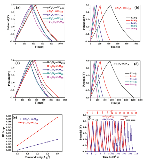 1/8電極的恒流充放電曲線;(e)不同電流密度下g-C