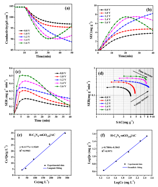1/8||AC電極在CDI電池中各電壓下的(b)SEC和(c)SER曲線及(d)外加電壓對CDI Ragone Kim-Yoon圖的影響; H-C