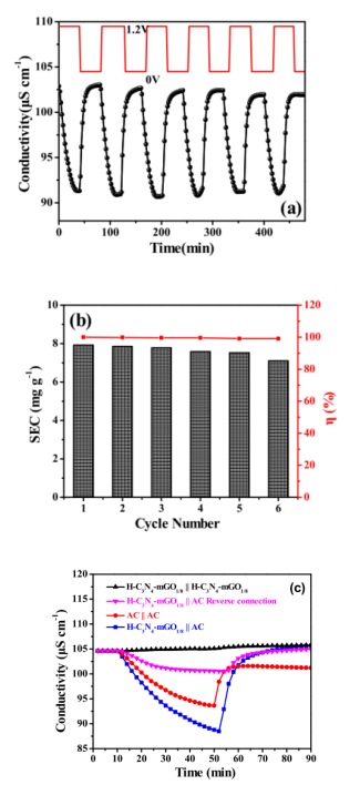 -1 NaCl溶液中1.2 V時的循環CDI實驗;(b)相應的柱狀圖;(c)AC||AC、H-C