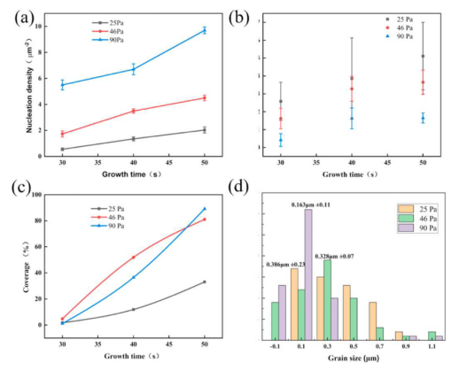 圖8.不同壓力下PECVD中石墨烯在銅表面生長的(a)成核密度,(b)疇尺寸平均值,(c)覆蓋面積,(d)疇大小分布。