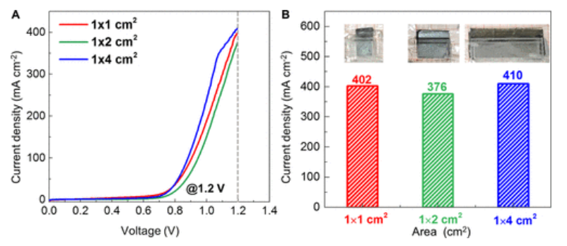 Figure 3. 擴大 ABEEPO 的大小。 (A) ABEEPO 的極化曲線,面積分別為 1 × 1 c m