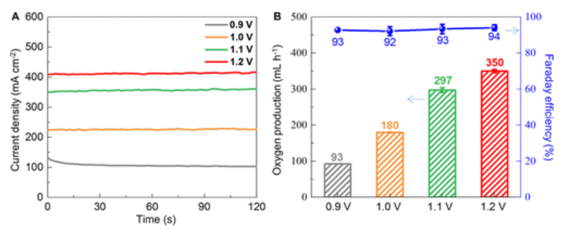 2) 下,施加電壓對 ABEEPO 性能的影響。 (a) ABEEPO 的計時電流曲線在 0.9、1.0、1.1 和 1.2 V 下運行。(b) 相應的制氧速率和法拉第效率。陽極 IrO