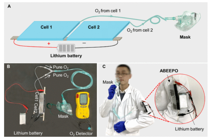 Figure 8. ABEEPO的應用演示。 (a) 供氧系統示意圖。 (b) 供氧系統的光學照片。 (c) 為 ABEEPO 患者供氧。