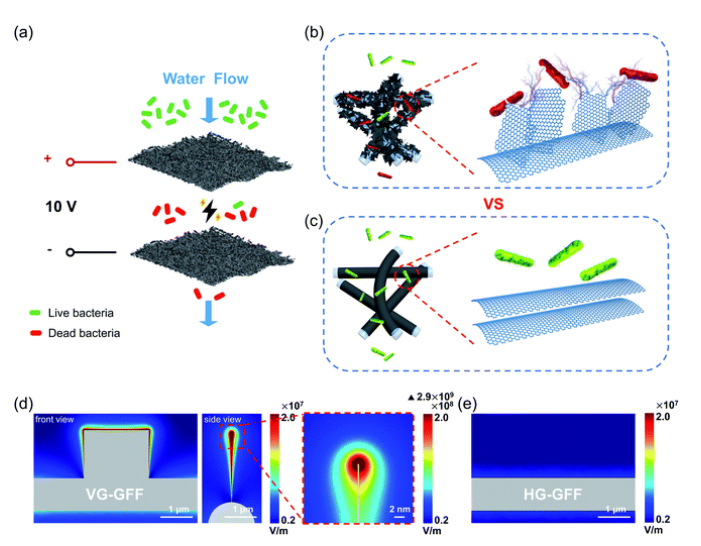 Figure 1. 多功能一級動態水過濾消毒EF-VG-GFF系統的設計。 (a) EF-VG-GFF 純化系統的結構。 (b 和 c) 用作系統中電極的 VG-GFF (b) 和 HG-GFF (c) 的示意圖。 (d) VG 周圍的模擬局部 EF,以及側視圖中標記位置的放大圖像。 (e) 模擬 HG 周圍的局部 EF。模擬電壓為 10 V。
