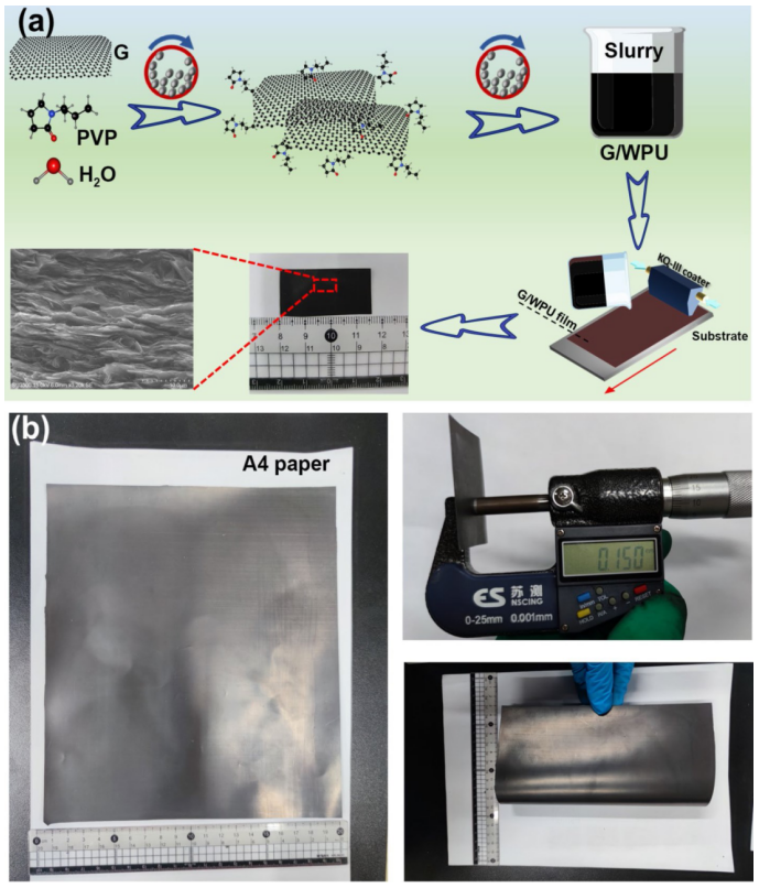 Figure 1. (a) 致密有序 G/WPU 復合薄膜的制備示意圖。 (b) G/WPU 薄膜的照片和厚度。