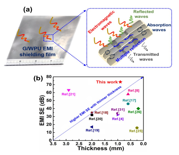 Figure 6. (a) 制備的致密 G/WPU 薄膜的 EMI 屏蔽機制示意圖。 (b) 本工作中 G/WPU 薄膜與其他一些報道的屏蔽材料的 EMI SE 性能比較。