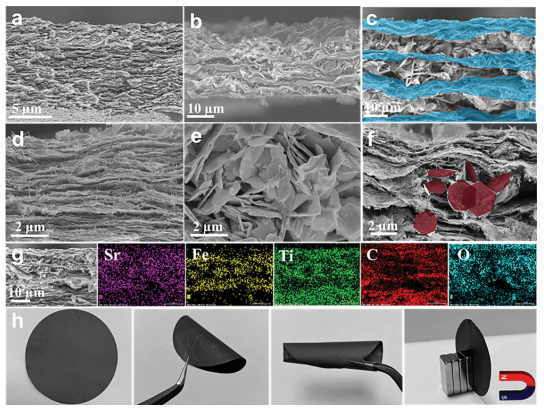 19薄膜的結構表征。a,d) MCF-1, b,e) MSF-1和c,f) MCSF-10的截面SEM圖像。g)元素映射和h) MCSF的數碼照片,顯示薄膜的柔韌性和磁性。