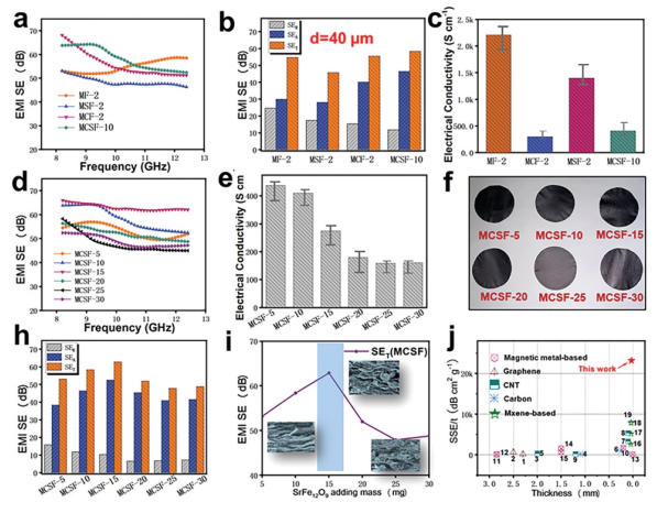 圖4. EMI屏蔽性能。a - c) EMI SE;SET、SEA、SER的比較;以及MF-2、MSF-2、MCF-2、MCSF-10在40 μ m厚度下的導電性能。,d,i) EMI SE, e)電導率,f)數碼照片,h) MCSF-5、MCSF-10、MCSF-15、MCSF-20、MCSF-25的SET、SEA、SER比較。j)電磁干擾屏蔽效能隨厚度變化的比較。
