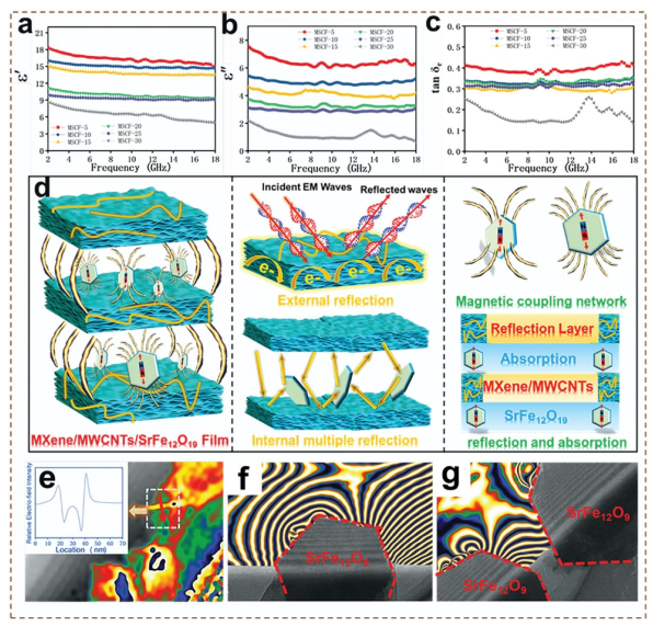 19薄膜中的相關EM機制。e)重構的相位圖像和對應的電荷密度分布線輪廓,f,g)重構的MCSF-10復合材料雜散磁場分布,表明界面極化和各向異性磁性增強了磁耦合。