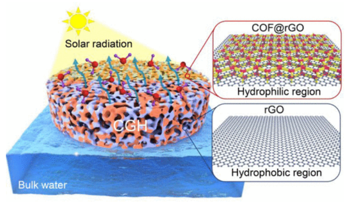 太陽能發電是一種可持續的水處理技術,有助于緩解全球水資源短缺問題。然而,由于水蒸發的高能耗導致蒸發率低,該技術面臨著巨大的挑戰。在這里,通過簡便的原位生長策略開發了一種共價有機框架(COF)/石墨烯雙區域水凝膠,在一種材料中包含親水和疏水區域。親水 COF 覆蓋部分疏水石墨烯區域。通過對兩個潤濕區域的精確控制,混合水凝膠顯示出有效的光捕獲、可調節的潤濕性、優化的水含量以及降低水汽化的能量需求。作為太陽能吸收器,雙區域水凝膠在 1 次太陽照射(1 kW m