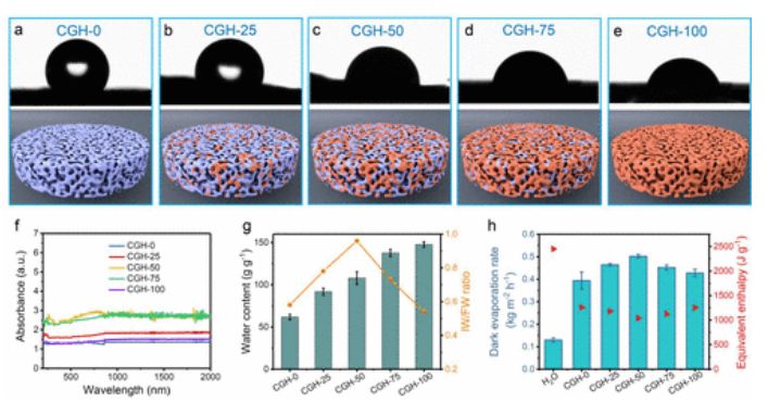 Figure 3. (a-e)冷凍干燥樣品的水接觸角和 CGH 中雙區域的相應示意圖,其中藍色區域代表純 rGO,而橙色區域代表 COF@rGO。 ( f )CGH的UV-vis-NIR吸光度。 (g) CGH 中的含水量和中間水 (IW) 與游離水 (FW) 的比例。 (h) CGH中純水和水的暗蒸發率和蒸發焓。 (g) 和 (h) 中的誤差線表示從使用不同樣品的五次測量中獲得的標準偏差。