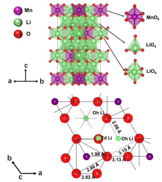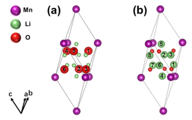6原電池的兩個視圖。為了在討論中使用,氧原??子在(a)中編號,鋰原子在(b)中編號。Li1、Li2、Li3、Li6、Li7和Li8原子占據LiO